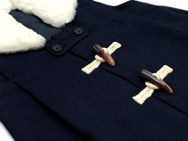 襟元は取り外し可能なふわふわのフェイクファー、表地は荒い目のダッフル生地でトグルボタンが特徴的な被布コートです。