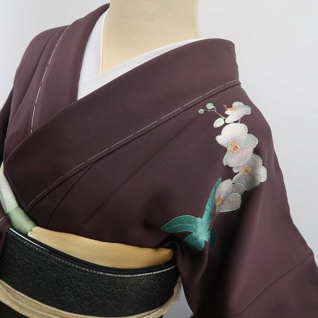 こちらのお着物は、赤褐色の深みある地に胡蝶蘭の白が映える端正な構図の一枚。