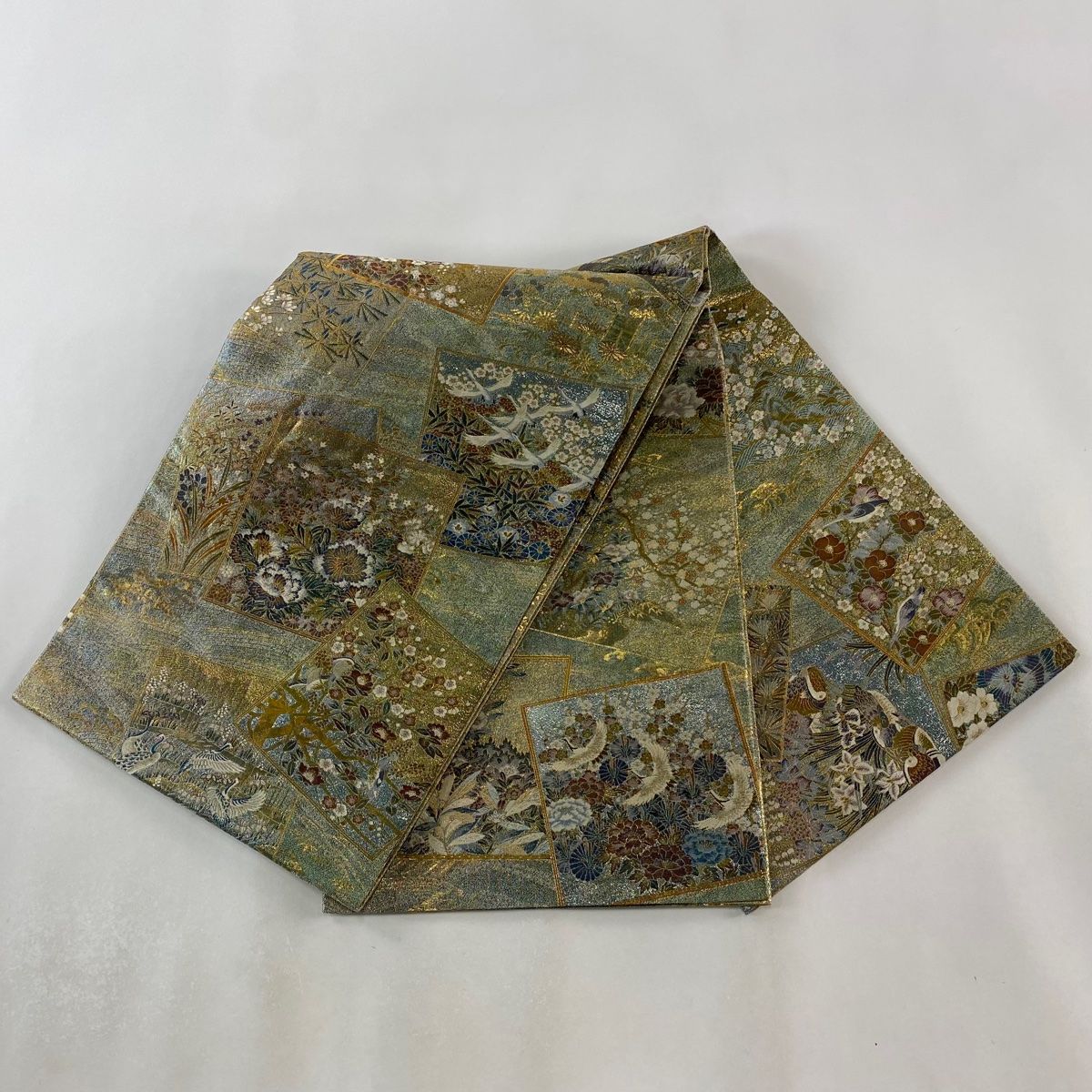 丸帯 加賀 百撰 色紙 花鳥 金糸 箔 灰緑 お太鼓柄 正絹