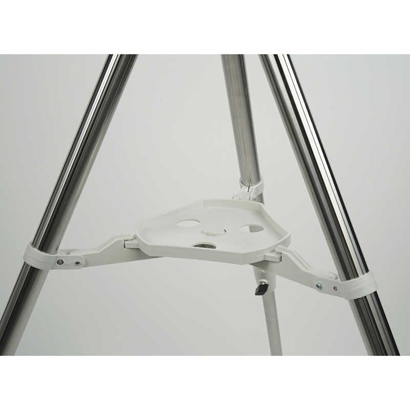 三脚は安定感のある伸縮式のステンレス製三脚を採用。お好みの高さに変更する事ができますので、楽な姿勢で観測できます。三脚ステーには標準でアクセサリートレイが付属していますので、接眼レンズなどを置くことができ夜間の観察時などにも便利です。