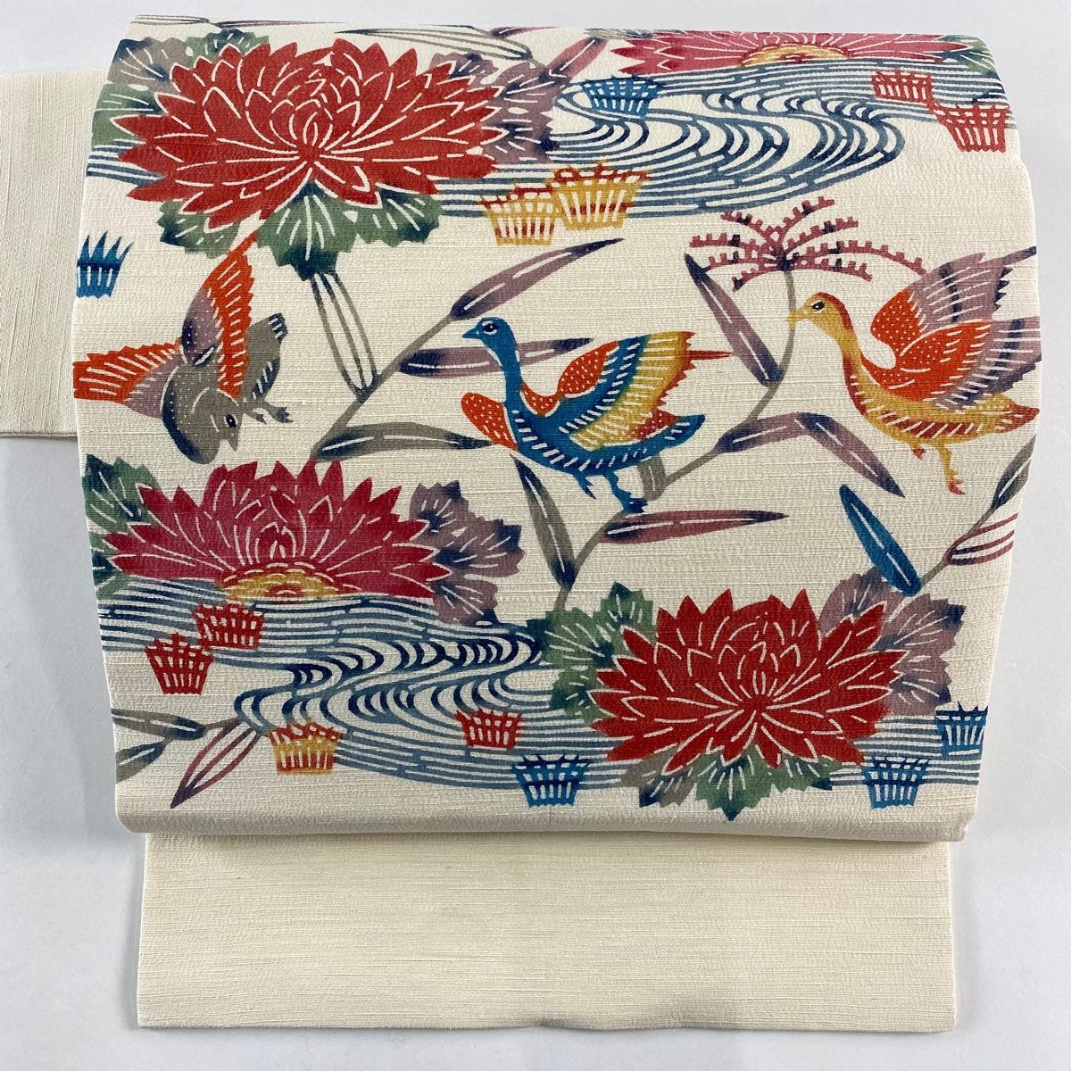 名古屋帯 秀品 紬地 花鳥 流水 クリーム 正絹