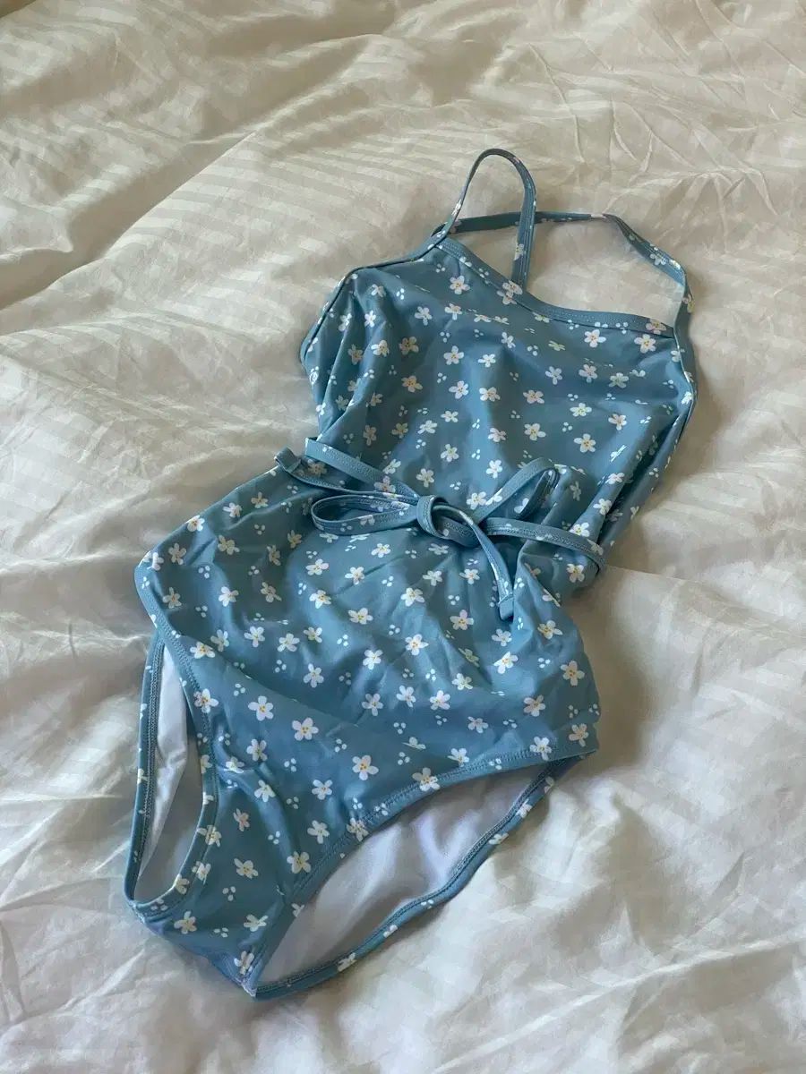 スカイブルーのバターンにキャモマイルの花が描かれたフールタイム キャモマイル タイバッグ M水着です。タイバッグ デザインでサイズ調整が容易です。