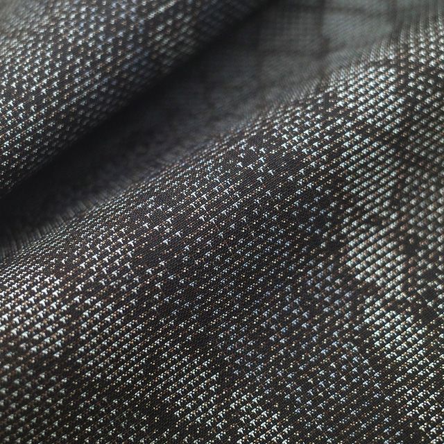 深みのあるミッドナイトグレーを基調に、モダンな菱格子文様が美しく織り上げられた一着。