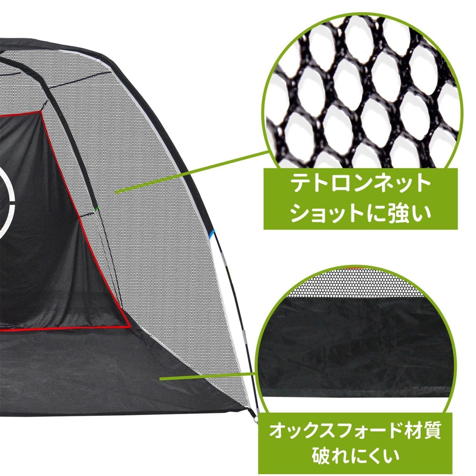 高い耐久性:ゴルフネットとターゲットは耐久性に優れています。摩耗や引っ張りに強く、長期間使用しても劣化しにくいです。さらに、天候や紫外線によるダメージにも強いため、屋外での使用にも適しています。強いショットや連続的な使用にも耐えられる設計で、長期にわたって安心してゴルフ練習が行えます。