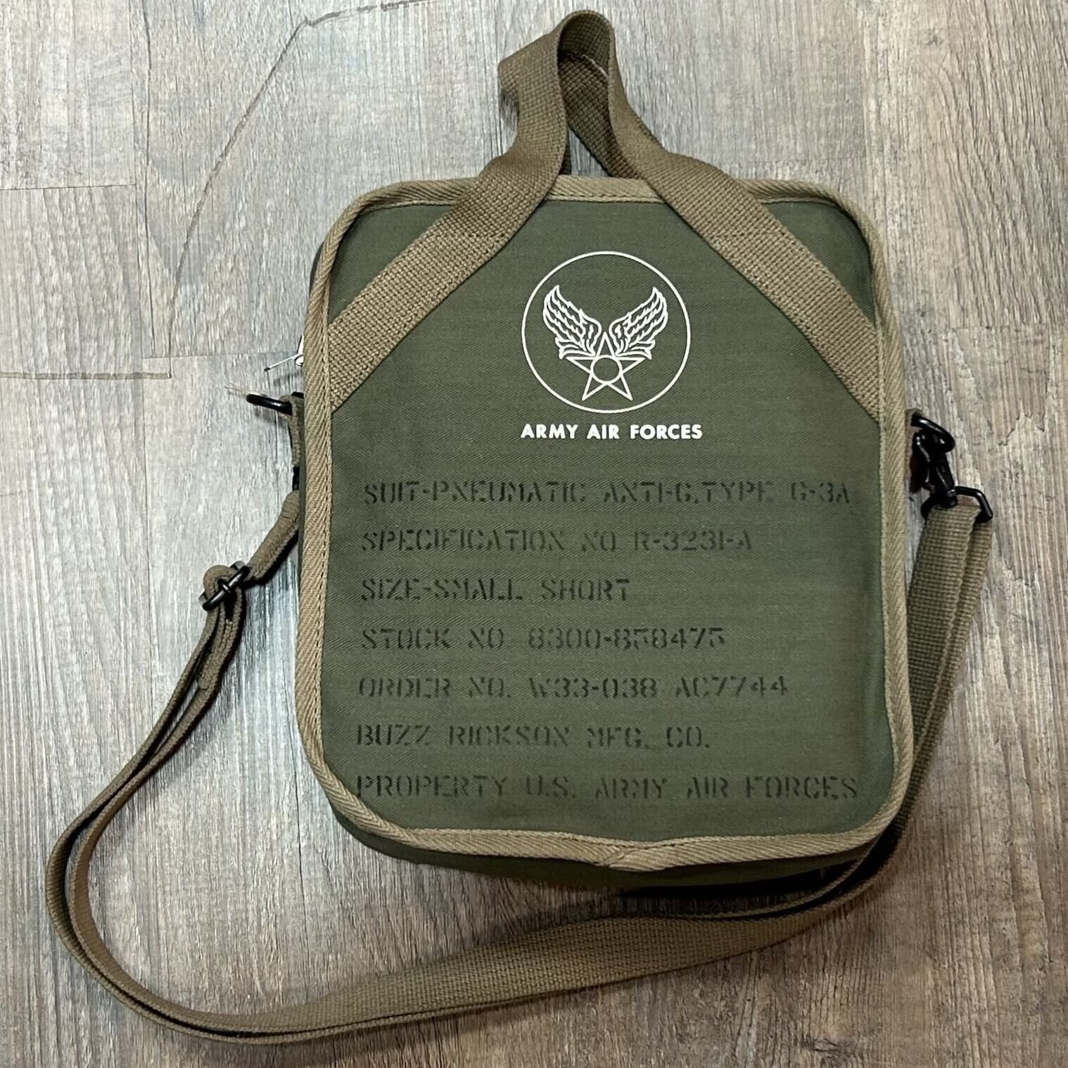 第二次大戦中、パイロットに掛かるGを軽減するため採用されたのがタイプG-3Aスーツである。強烈な負荷が掛かるGは血流に影響し、血液は脳から下半身に流れ、脳内の血液が欠乏すると視界が真っ黒になり、終いには意識を失った「Gロック」状態となってしまう。血液が手足の先端に流れないよう身体にコードできつく締めつけるスーツが開発された。そのスーツを収納するため付属したのがこのバッグである。縫い合わせ箇所には手間と時間を掛けたパイピングが施され、ジッパーは大戦型TALONジッパーを使用している。容量こそコンパクトであるが、転写式のエアフォースマークと、所狭しと施された目一杯のステンシルが陸軍航空隊のプライドを表している。