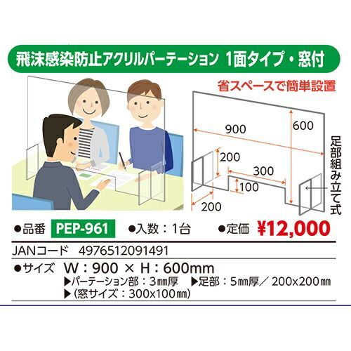 商品名#ベロス飛沫感染防止アクリルパーテーション窓付1面PEP-961