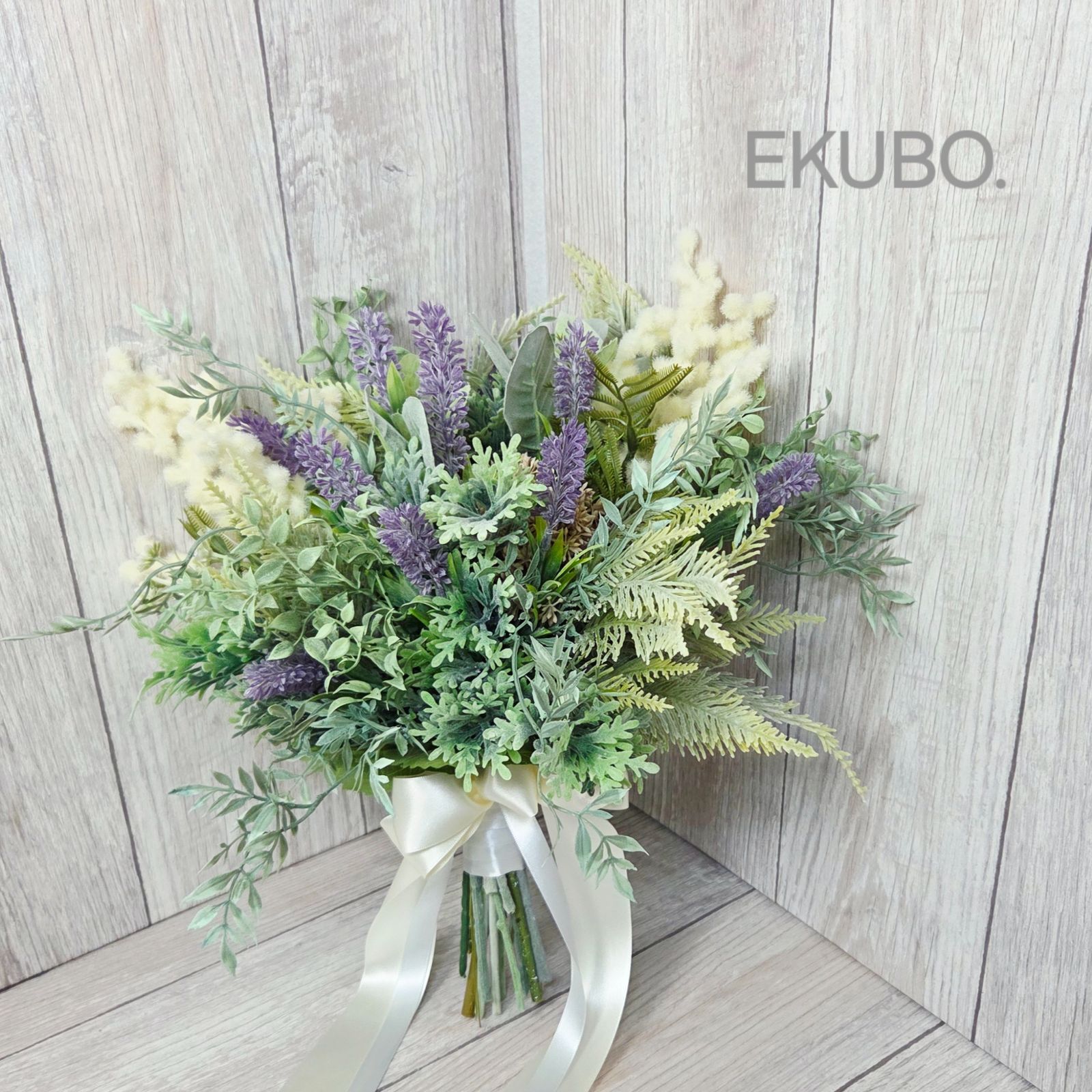数種のグリーンにラベンダーを合わせナチュラルでボリューム感のあるスタイルに仕上げました。ガーデンウェディングなどカジュアルな雰囲気によく合います。