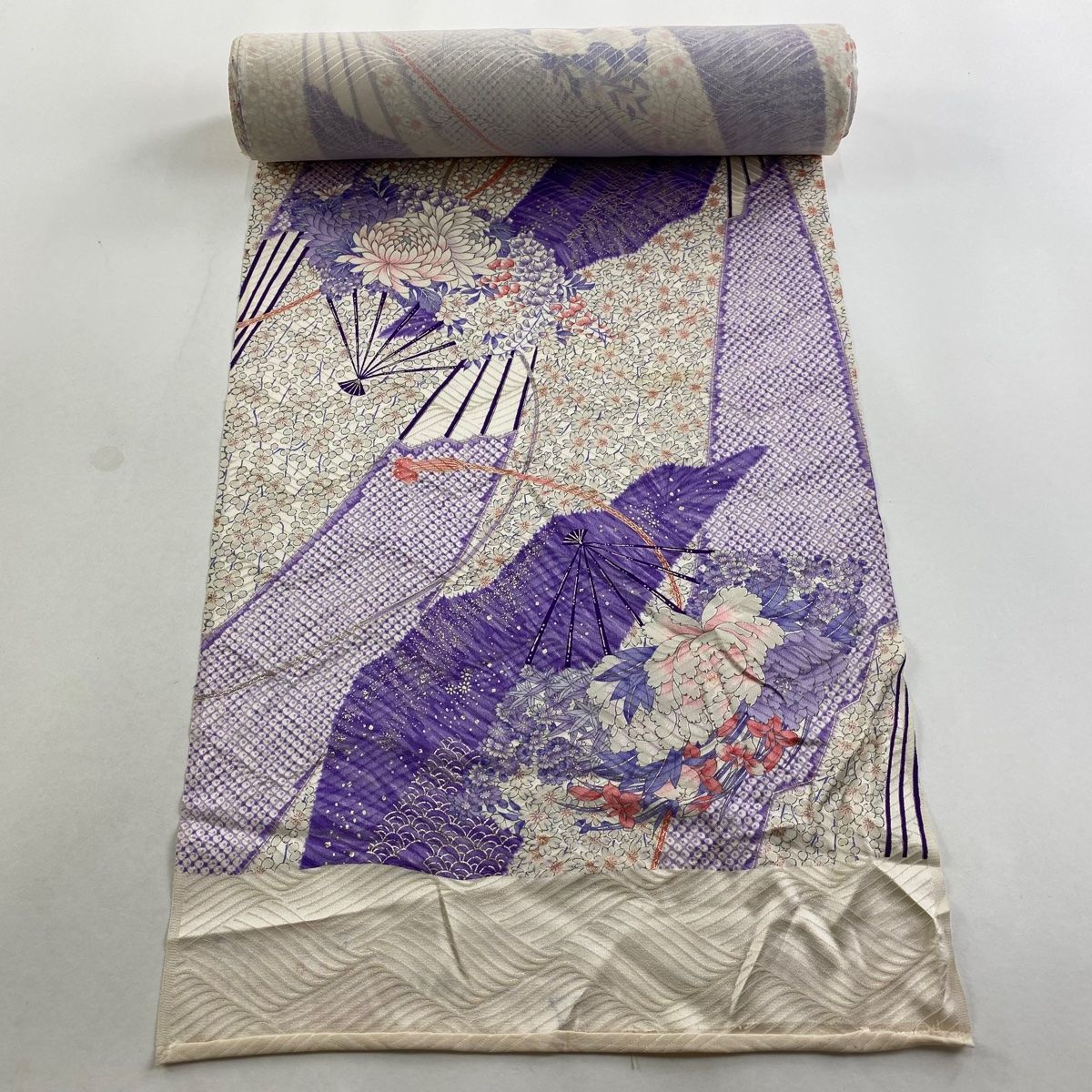 反物 秀品 小紋 花扇 梅 金彩 薄紫 正絹