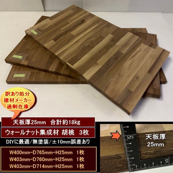 ウォールナット集成材 胡桃 くるみ 材 端材 3点セット 約18 kg 無塗装 400 765 25 mm 403 760 714 処分 重量あり DIY