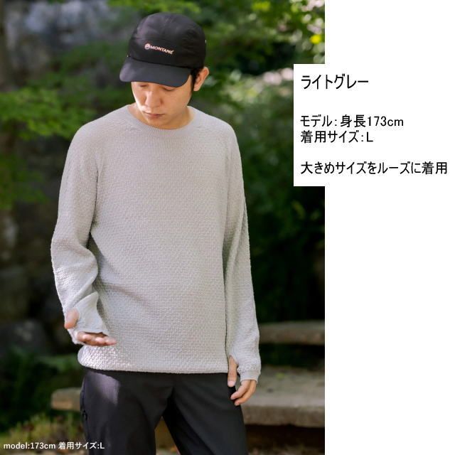 ウールを70%混紡し、保温性を高めました。冬場の登山でも身体の熱を逃がさず、体温をキープできて安心。ベースレイヤーとしても、ミドルレイヤーとしても活躍します。さらに指ぬき付きで、手のひらを冷やさず細かな作業ができる。スマホやカメラで、一瞬のシャッターチャンスを逃しません。大きめサイズを緩めに着こなせば、タウンユースでも様になるシルエット。このために敢えて、男性にとってもルーズフィットなLサイズをご用意しました。