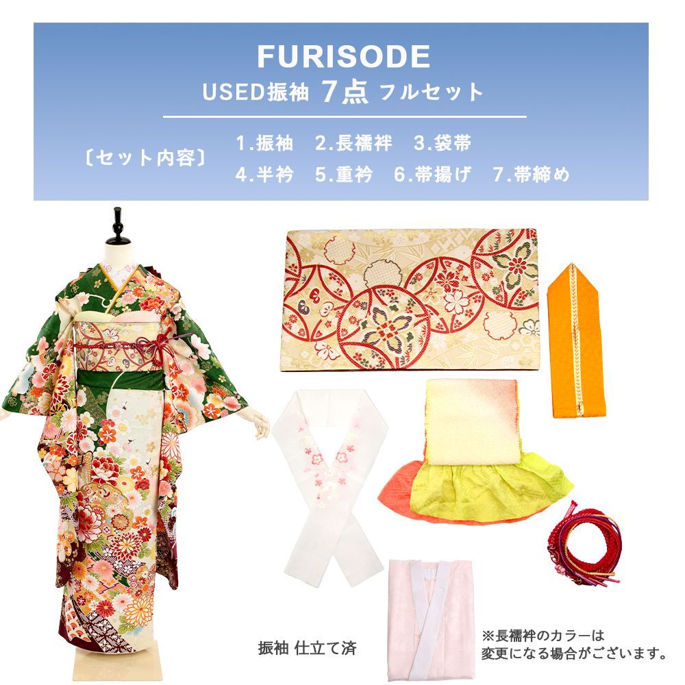 振袖 振袖フルセット 振袖セット 緑 古典柄 熨斗 7点フルセット レディース Lサイズ WA-F-7