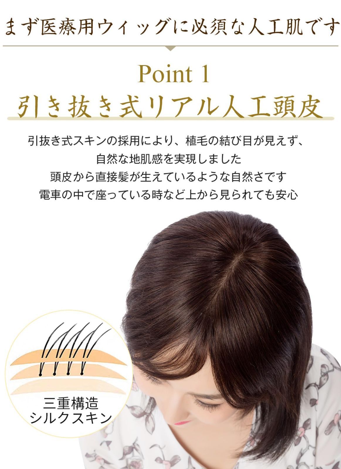 総手植え:職人が髪の毛を一本ずつ手作業で植え付けることにより、髪の流れやボリュームが非常に自然になります。特に髪の生え際は手作業で丁寧に仕上げられており、他の人が見てもその部分が自然に映り、ウィッグであることが気づかれにくいデザインです。