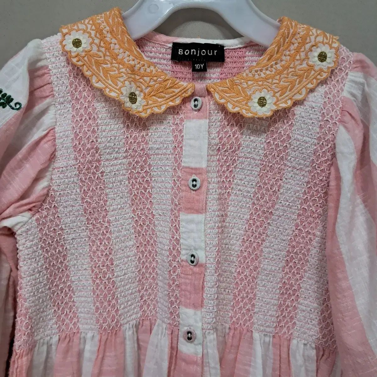 ボンジュールストライプのシャツドレスです。シャツの前面と袖には繊細な刺繍が施されています。このドレスは、お子様をさらに目立たせる素敵なデザインです。ご不明な点がなければ、すぐに安心してお支払いいただけます!