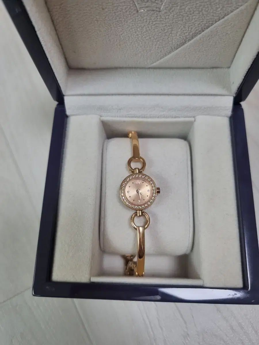これはJSTNAローズゴールドブレスレットウォッチです。ほのかなローズゴールドカラーにキュービックがちりばめられているので高級感があります。付属品完備は新そのまま