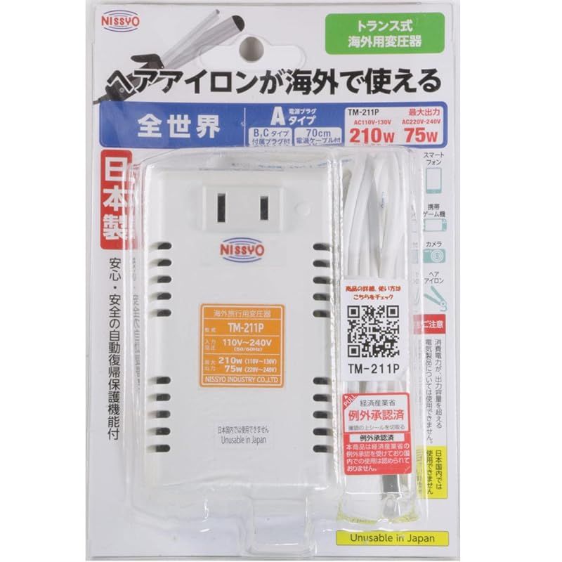 商品名:日章工業 変圧器 海外 旅行用 トランス式 AC110/220V~AC130/240V(50/60Hz)→AC100V 210W/75W TM-211P