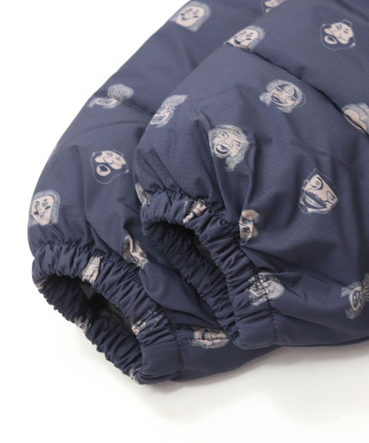 総柄のリップ生地にマッドな光沢をプラスした、サラサラとした触り心地の中わたスタンドジャケット。