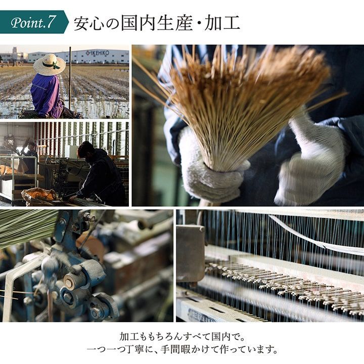 国産(九州産)のい草を使用しており、一本一本が太く、表皮が厚く繊維がキメ細かいので弾力性があり耐久性に優れています。