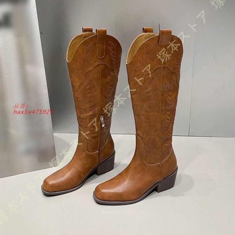 スクエアトゥ太ヒールウエスタンブーツ レディース ロング丈 ローヒール カジュアル ロングブーツ レトロ シンプル おしゃれ 疲れない ジッパー hax 5 v 475925