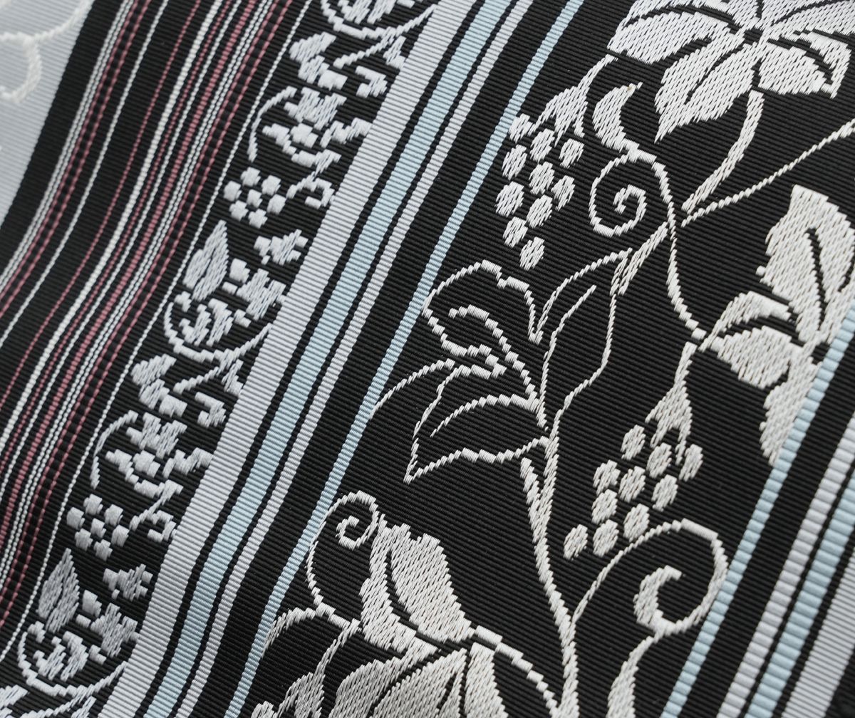 色は黒地にブルーグレー縞で合わせ易い葡萄唐草の全通柄です。