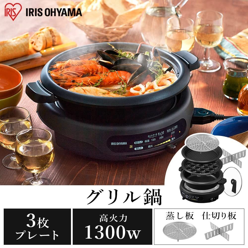 アイリスオーヤマ ホットプレート 電気鍋 グリル鍋 3枚タイプ 深鍋 焼肉プレート たこ焼きプレート 保温~約250℃ 保証付き 高火力1300W 2~4人用 IGU-B3-B ブラック