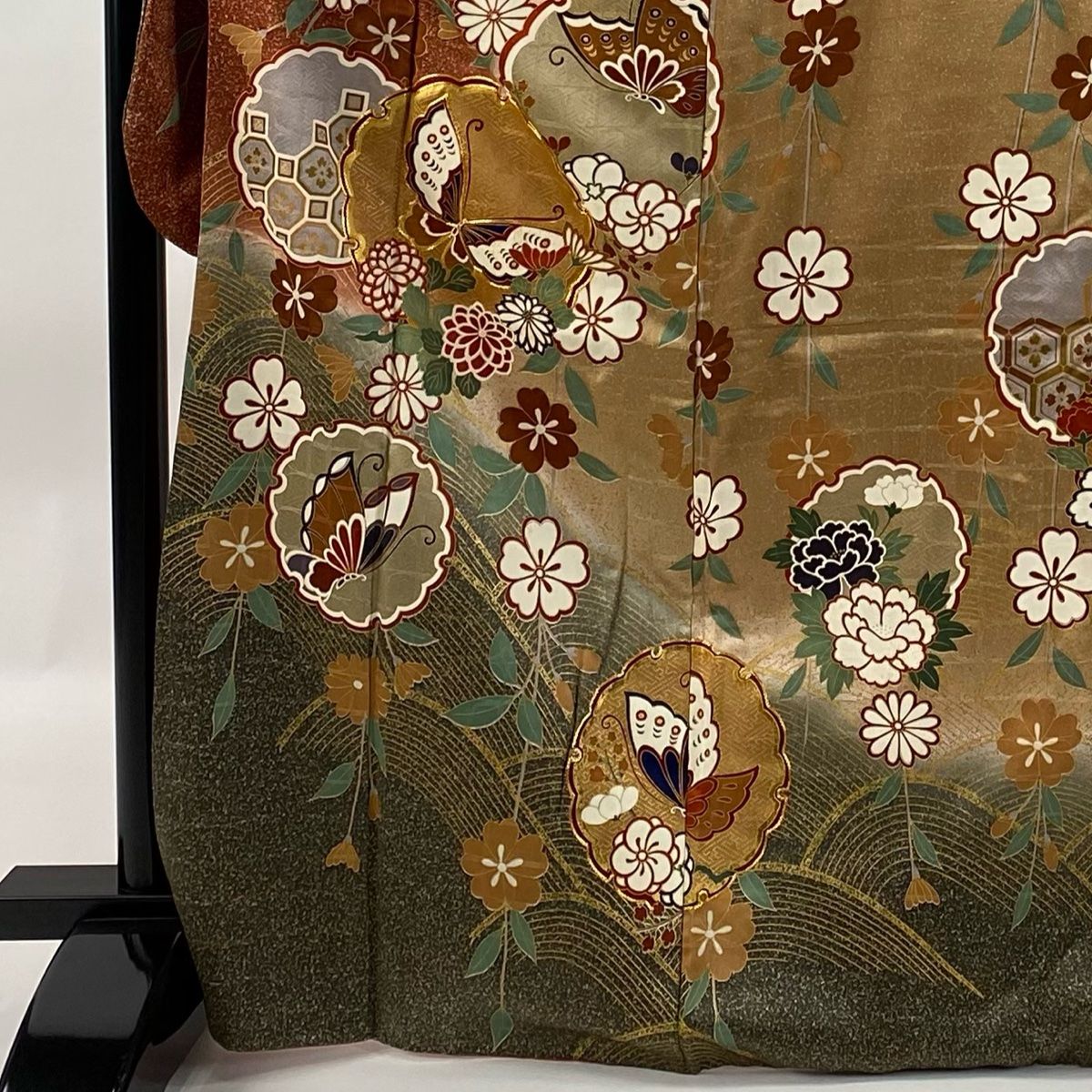 振袖 身丈169 cm 裄丈67 M 袷 蝶 雪輪 金彩 金糸 赤茶 正絹 秀品