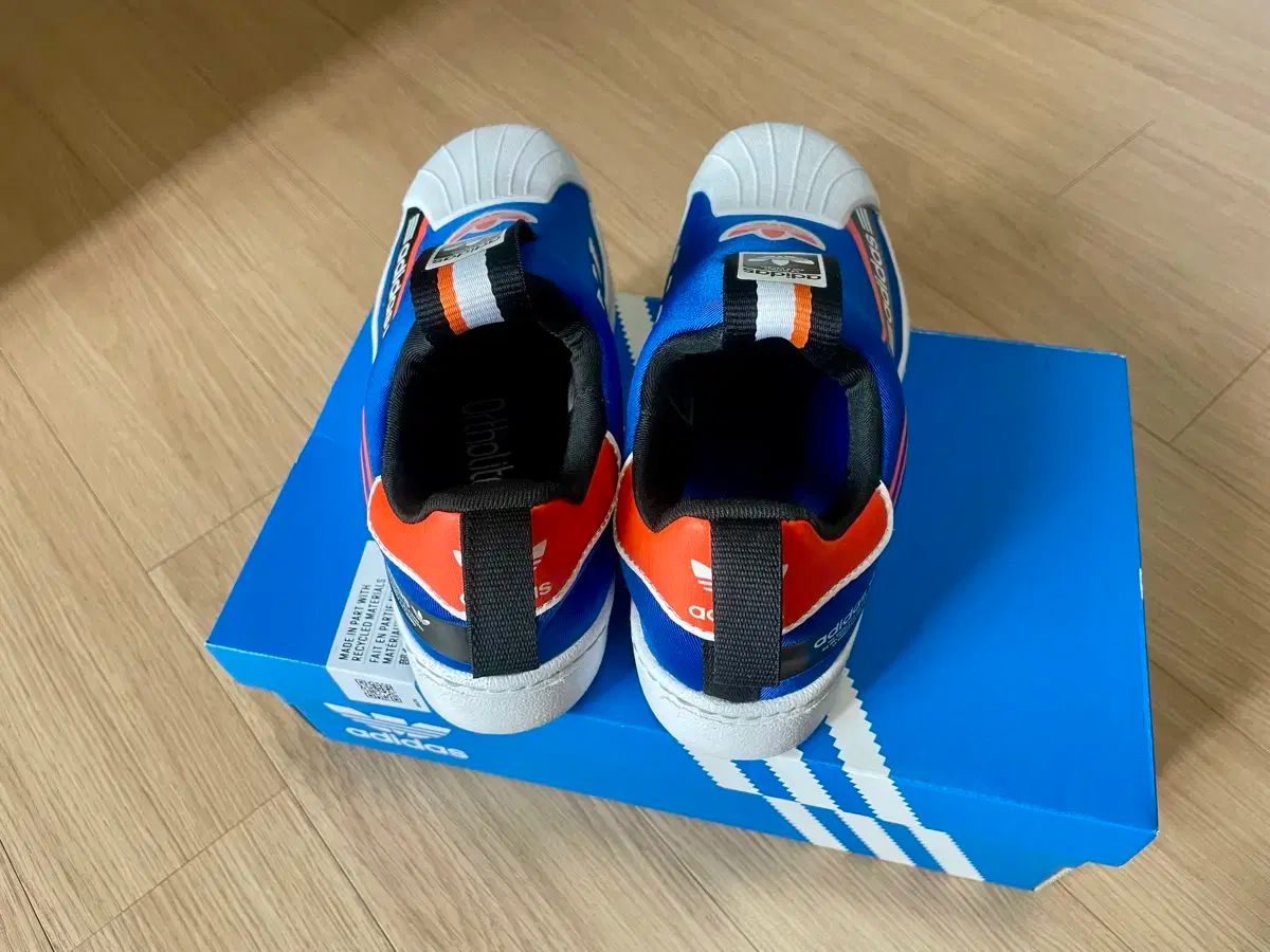 これはアディダススーパースター360ブルースリッポンです。スリッポンなので、子供でも着脱しやすいと思います。サイズは写真の箱を参考にしてください!ご不明な点がなければ、すぐに安心してお支払いいただけます!