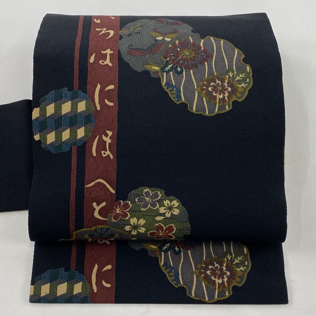 名古屋帯 秀品 雪輪 文字紋 縮緬 黒 正絹
