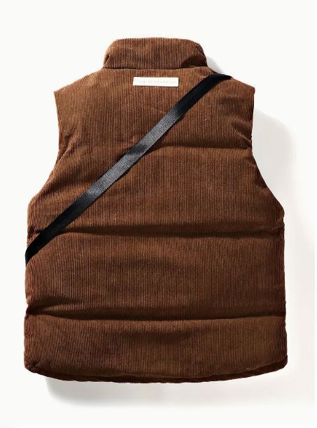 このブラウンのダウンベストは、コーデュロイ素材が高級感を演出。