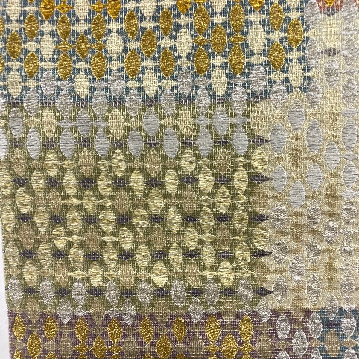 袋帯 秀品 幾何学模様 金銀糸 箔 ベージュ 六通 正絹