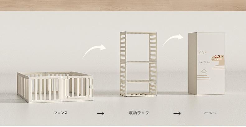 マルチな機能を備えたベビーサークルが新登場!6か月以上の赤ちゃんに最適な広々としたプレイスペースが提供でき、安全性も万全です。マット付きでサークルとして利用しない場合は収納棚に変更も可能で、使い勝手も抜群です。更に、折りたたみ可能なので移動や収納もラクラク。お子様の成長に合わせて大きさを変えることができ、長くご利用いただけます。