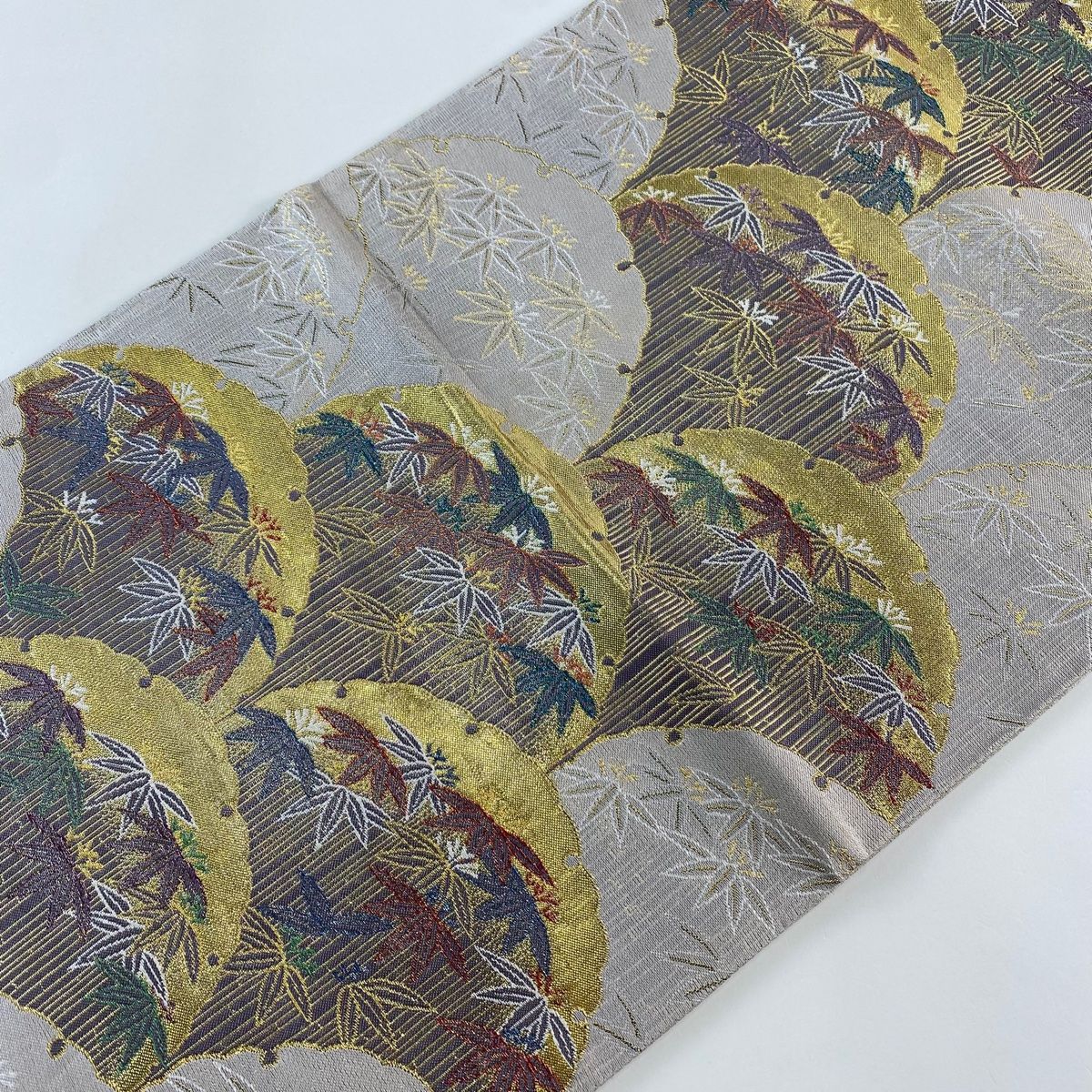 袋帯 秀品 笹 銀杏青海波 箔 灰茶 六通 正絹