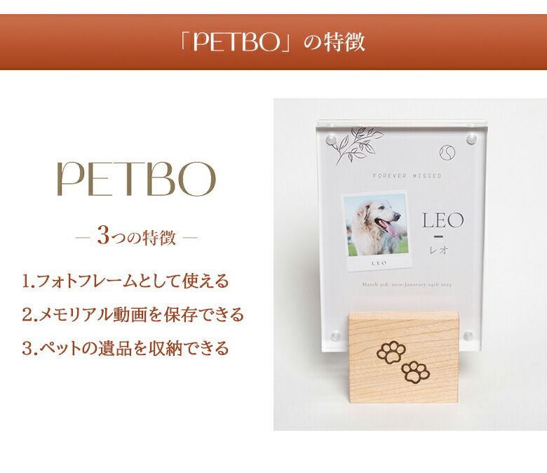 『PETBO』は、ペットとの絆を永遠に繋ぐことを目指し、大切な思い出の詰まった写真・動画・声を収めたメモリアル写真立てです。お持ちの写真・動画をQRコードに永遠に保存することができるので、世界にひとつだけの愛するペットの記念碑をかんたんに作れます。スマートフォンでQRコードを読み取るだけで、いつまでもペットのメモリアル動画にアクセスできます。最新技術で、データ管理不要メンテナンスフリーなので数十年後でもメモリアル動画を楽しむことができます。電源が不要なので室内のどこにでも置くことができ、ペットの遺品 (毛・爪・遺灰の収納)も収納できます。2色のカラーからお選びいただけます。