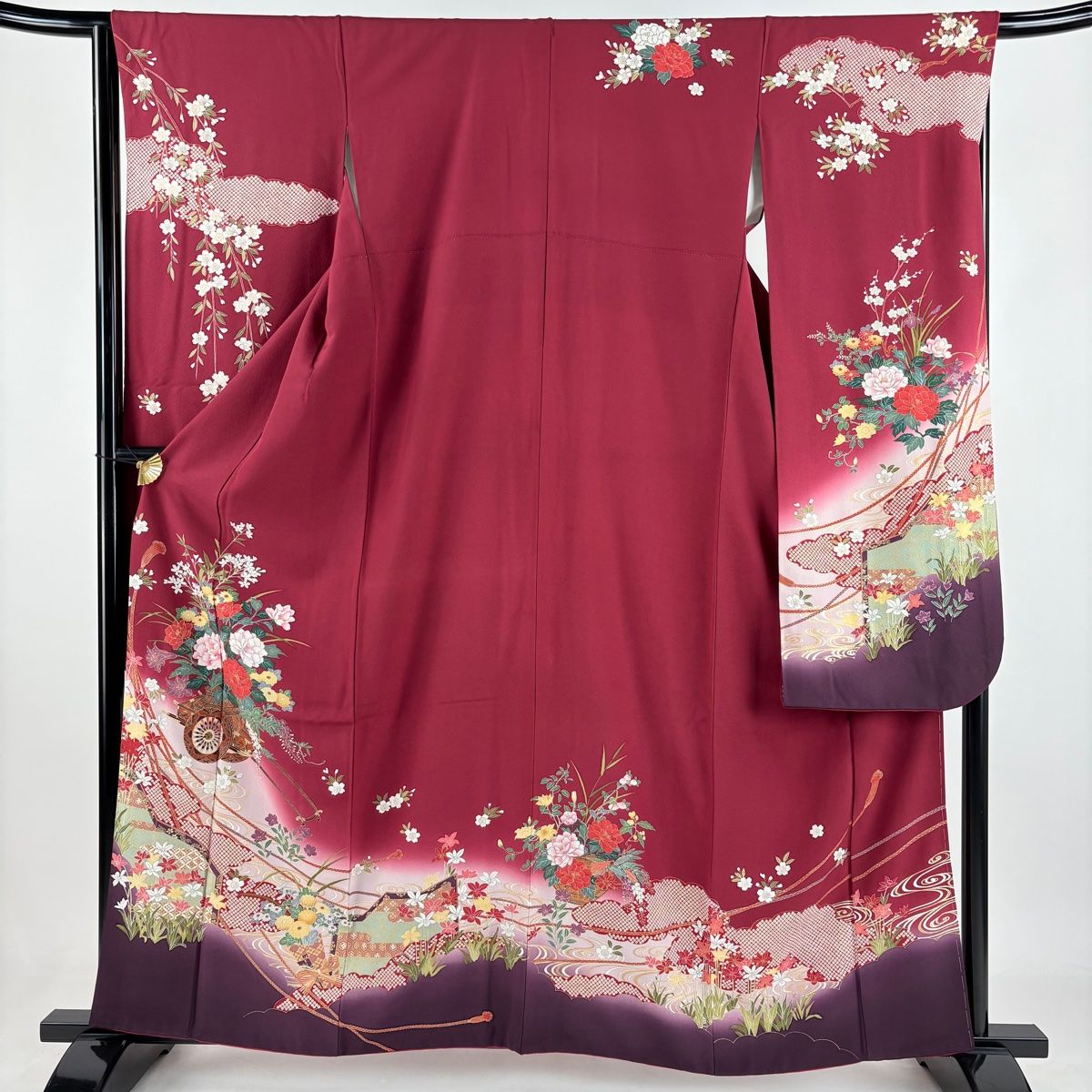 振袖 身丈160 cm 裄丈65 M 袷 花車 流水 金彩 ぼかし えんじ色 正絹