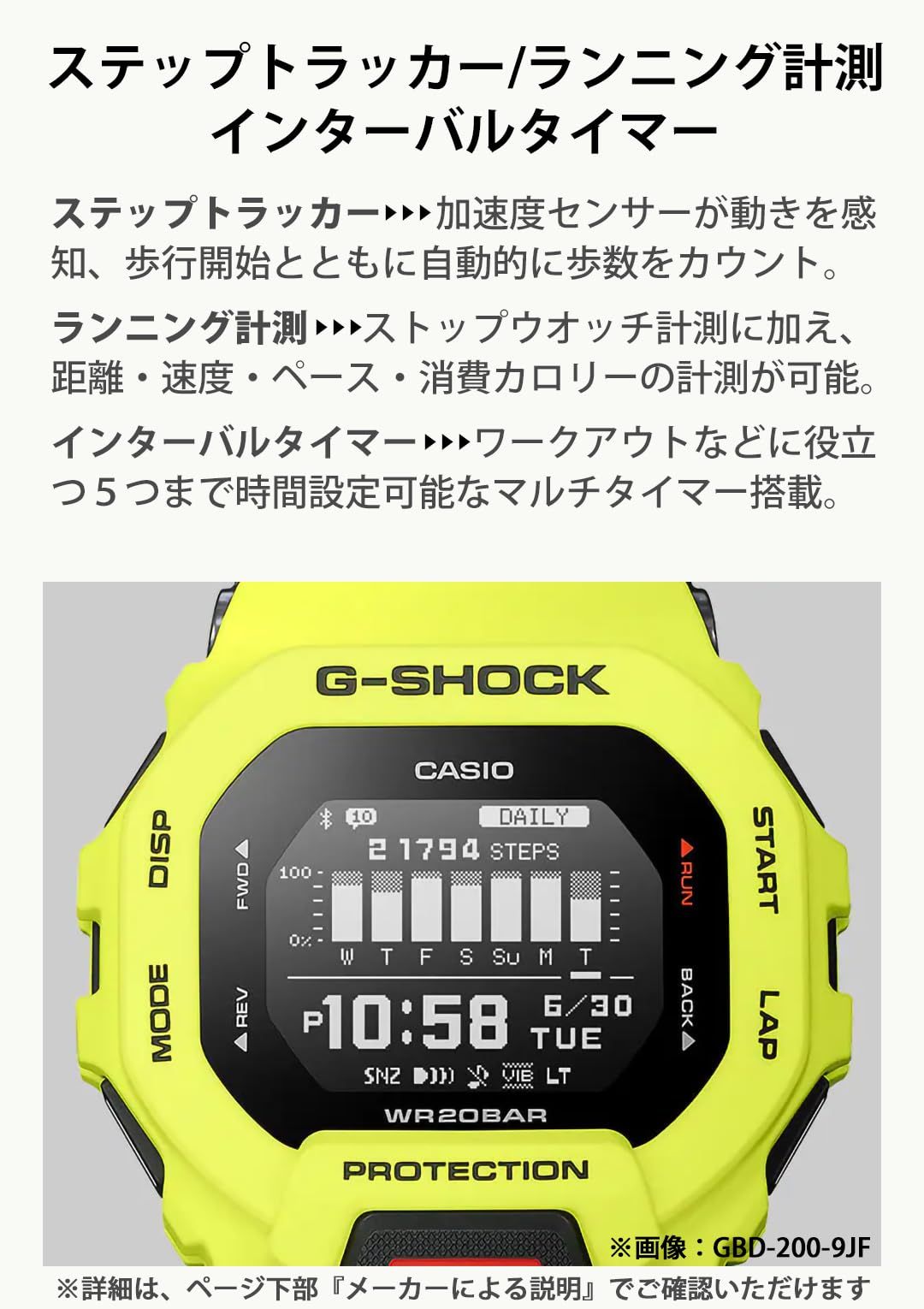 ●トレーニング機能:加速度センサーによる距離、速度、ペースなどを計算して表示、自動/手動ラップ機能、オートポーズ機能、到達お知らせアラート設定機能(時間、消費カロリー)ON/OFF切替機能、トレーニング表示カスタマイズ機能(計測タイム、距離、ペース、ラップタイム、ラップ距離、ラップペース、平均ペース、速度、平均速度、消費カロリー)