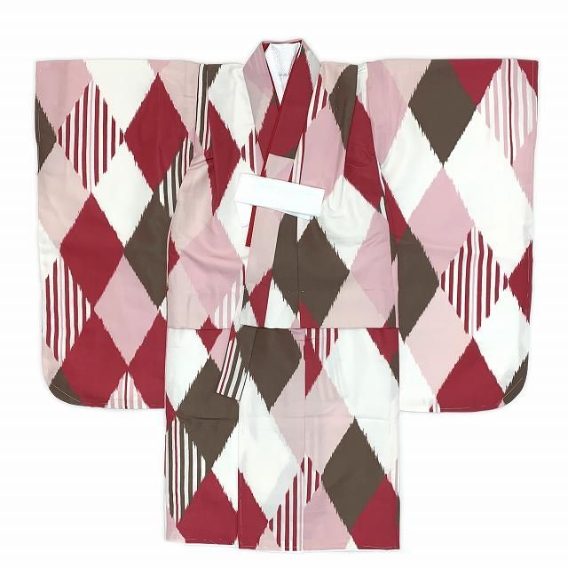 七五三 着物 セット 3歳 男の子用 モダン柄の着物とダッフル被布の2点セット 合繊 赤x茶系 菱 -8-1