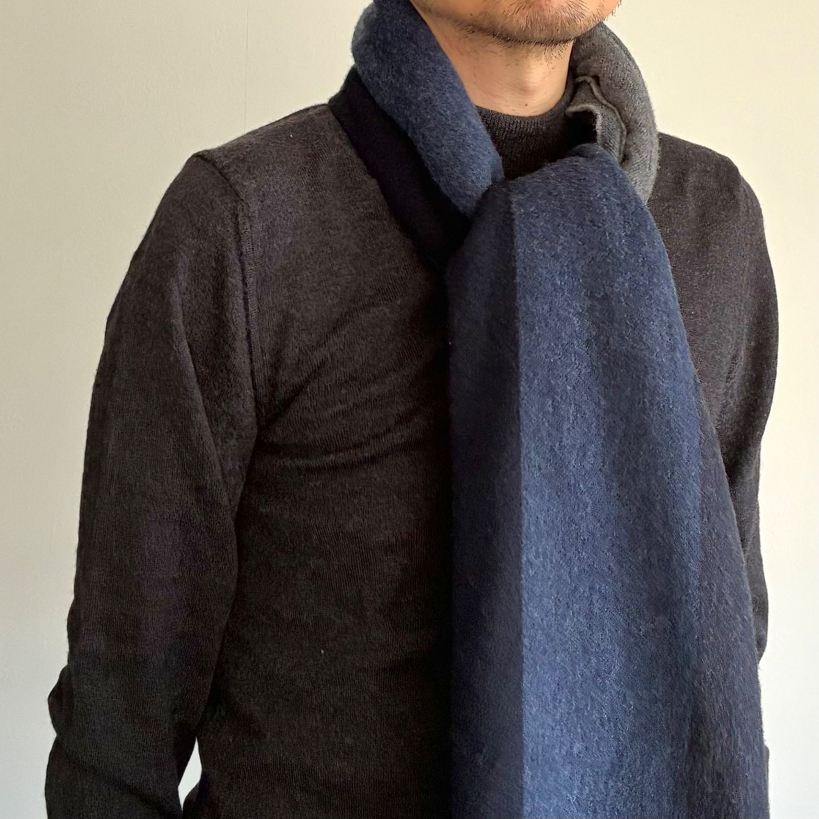 ネイビーをベースに、ブルー、グレーで構成された上品な配色の大柄なストライプ。マフラーの中央部分で配色が切り替えられており、グレーベースの配色も楽しめます。