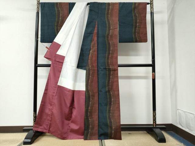 平和屋着物 上質な紬 よろけ縞 花唐草文 正絹 yc