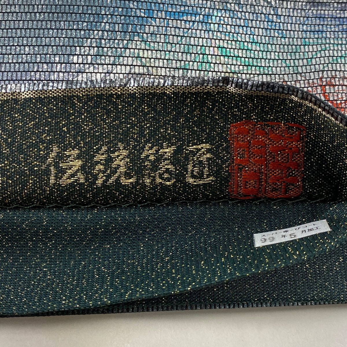 袋帯 秀品 落款 葉柄 箔 青灰色 お太鼓柄 正絹