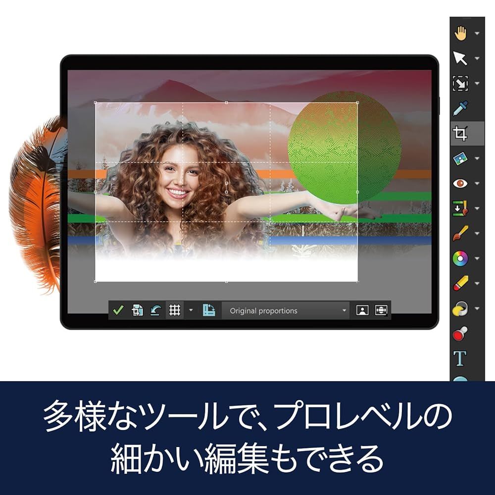 「主な仕様」ポイント1:「PaintShop Pro 2023 Ultimate」は、AIを使った写真編集ソフトです。SNSに投稿する写真や、資料に使う画像などの編集におすすめです。上位版の本製品には、次のソフトや素材が搭載、収録されています。