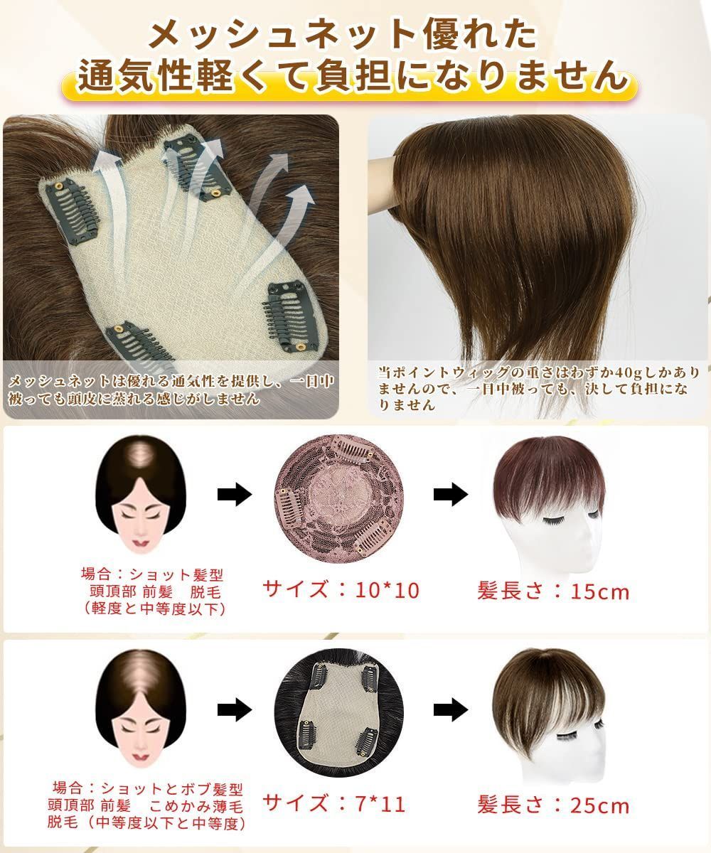 「部分ウィッグ商品情報」①(幅):横約7cm*縦11cmほど。②人毛の長さ:前髪:約10CM 後ろ髪:約25CM ③カラー:自然色(日本人の一般的な髪の色) & モカ色 ④重さ:40g