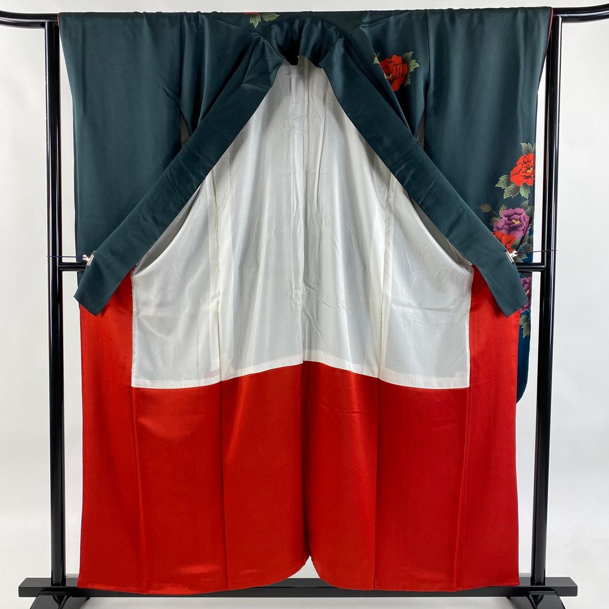 振袖 身丈157 cm 裄丈64 M 袷 牡丹 枝梅 金彩 ぼかし 深緑 正絹 秀品