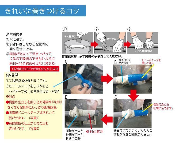 □用途:金属、プラスチック、PVC、FRP、セラミック、ガラス、ゴムなどの配管やホースの補修