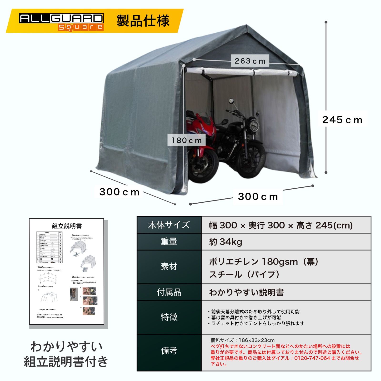 ALL GUARD square ガレージテント 3 m カバー カーポート パイプ車庫 テントガレージ キャノピー テント タープ 大型 車 駐車 倉庫 収納 物置
