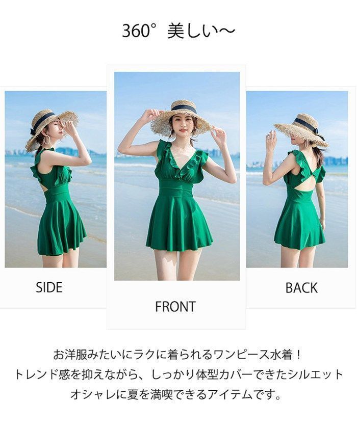 水着 ワンピース レディース ワンピース水着 体型カバー オールインワン フ 胸パッド付き スカート Vネック フリル クロスバック 黒 緑 女性 女子 温泉 旅行 海 リゾート 20代 30代 40代 gaofei 06