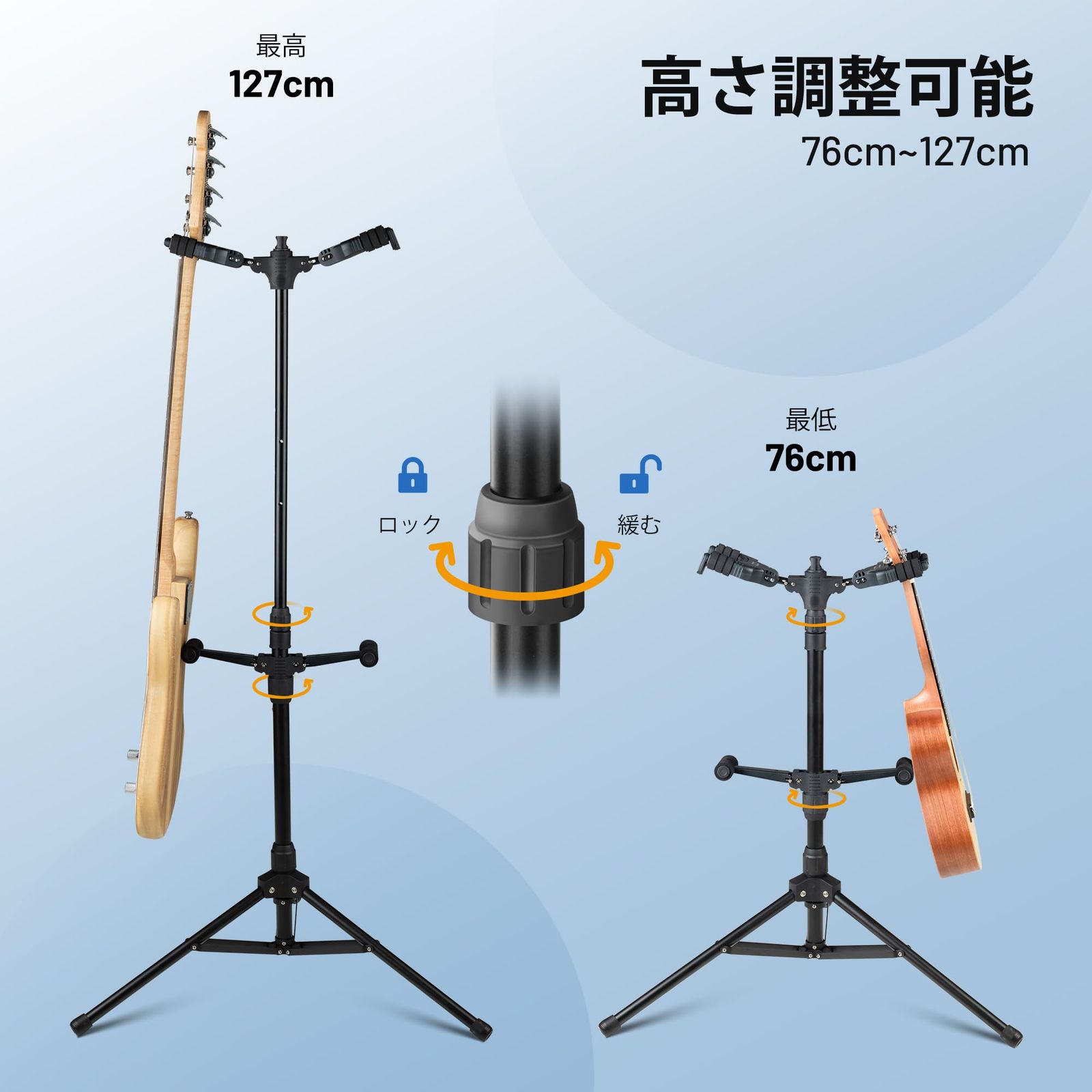 【高さ調整可能・優れた安定性】この多用途ギタースタンドの高さは調整でき、長い楽器にも短い楽器にも様々な楽器に適用します。また、優れた安定性を持っています。