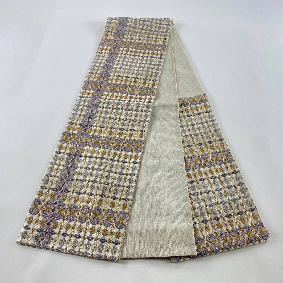 袋帯 菱 幾何学 金銀糸 刺繍 クリーム 六通 正絹