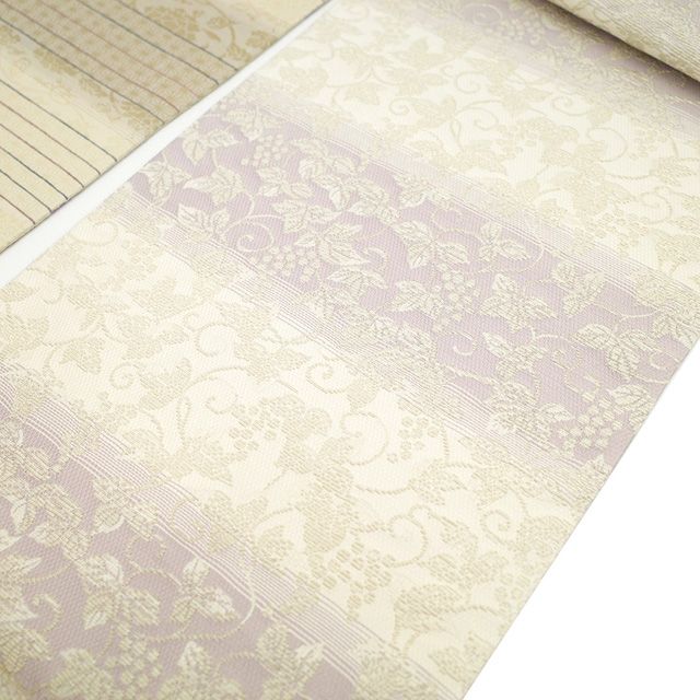 もう一方は、オフホワイト×薄紫地に葡萄唐草が銀糸の金華山織で織り上げられています。