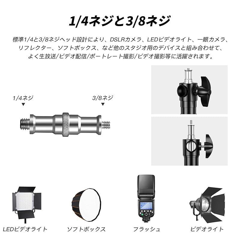 【幅広い互換性】1/4″と3/8″ネジアダプターが付きで、ソフトボックス、ストロボ、モノライト、LEDライト、リフレクターなど、ほとんどの写真機器と非常に互換性があります。屋内外での使用に最適で、さまざまな写真やビデオの撮影状況に優れたサポートを提供します。