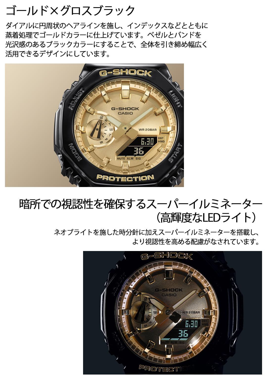1983年の発売以来、飽くなき強さを求めて進化を続けるタフネスウオッチG-SHOCK。八角形デザインが特徴的なGA-2100シリーズのカラーモデルです。モデル全体を光沢感のあるブラックで統一し、フェイスに人気のゴールドの蒸着文字板を採用。シックでファッションアイテムとして活用できるデザインに仕上げました。タフネスとデザイン性を両立した、幅広くご利用いただけるクールなデザインとなっております。