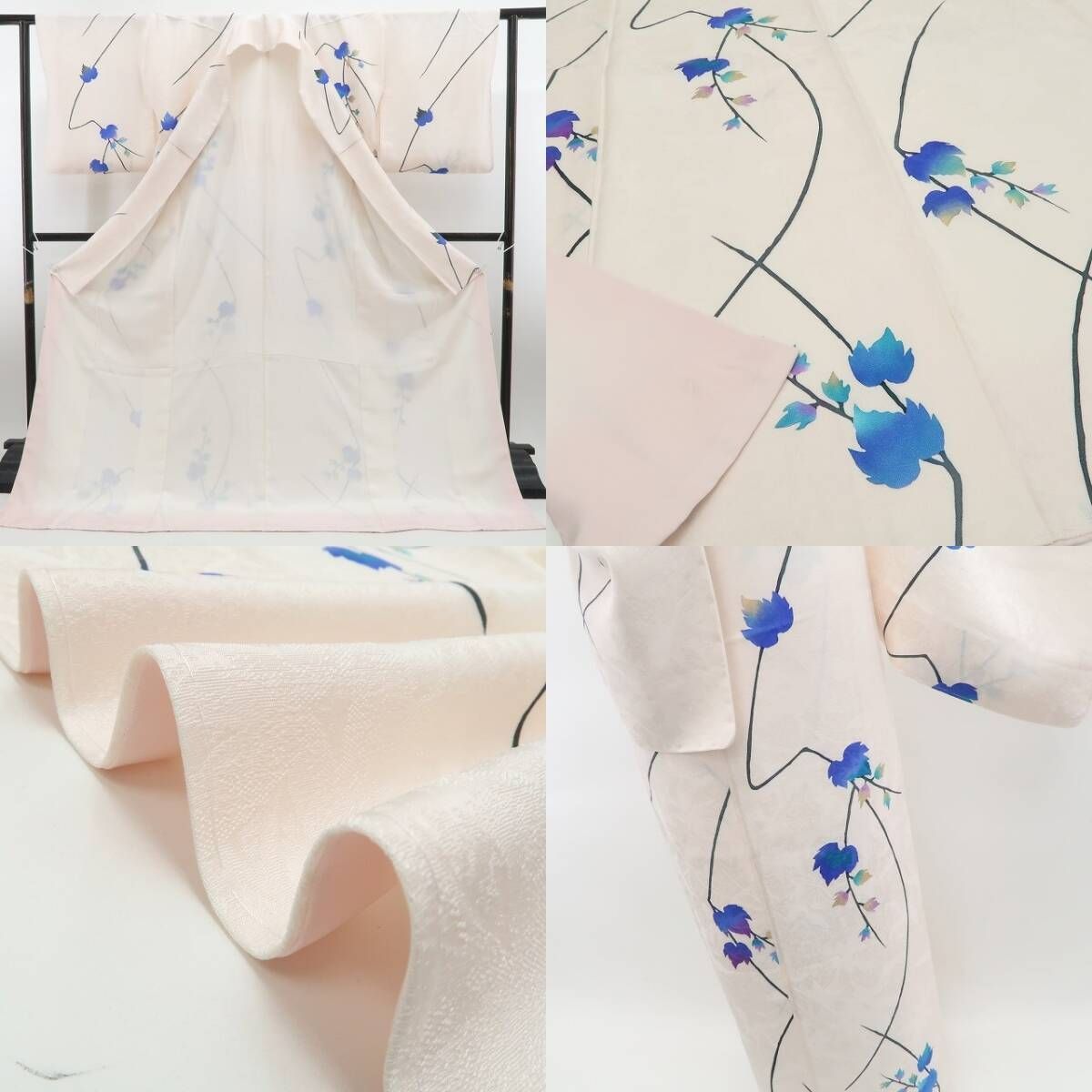ほんのりとした桜色の地に広がる柔らかな艶、巧みな構図で色を挿すデザイン蔦葉の流線模様、絵画調のタッチで浮かび上がるその表情は正に創作着物の奥行そのもの、季節の装いにお奨めです。